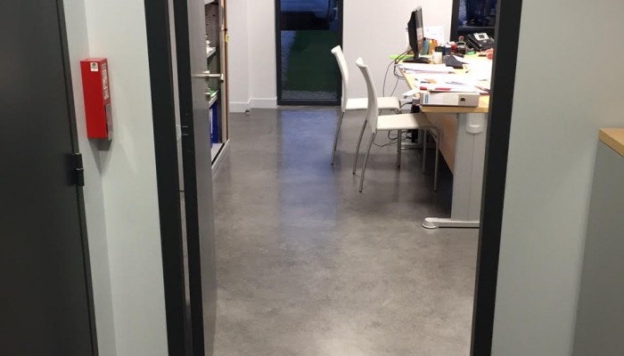 Ponçage d'un sol quartzé dans des bureaux, Extension d'un siège social près de Lamballe - Finition aspect mat sur béton quartzé 250m2